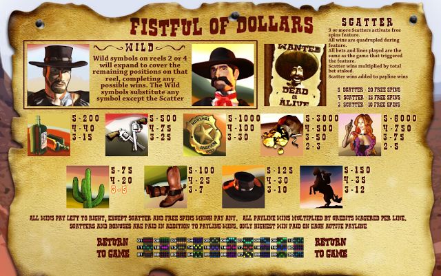 Fistful of Dollars is a multi-coin, multi-denominational machine with units of $/Β£/β¬ 0.01 to $/Β£/β¬ 0.10 and a maximum of ten coins per line. For a minimum wager of $/Β£/β¬ 0.01 and maximum wager of $/Β£/β¬ 30.00 per spin.